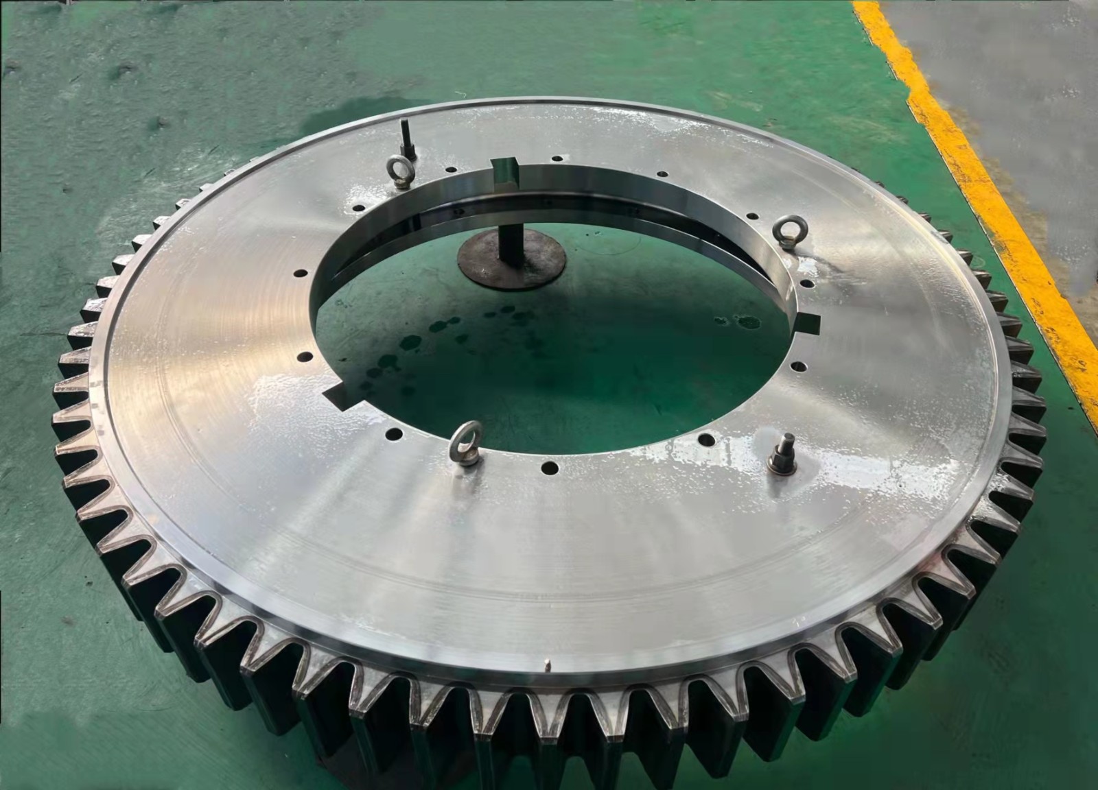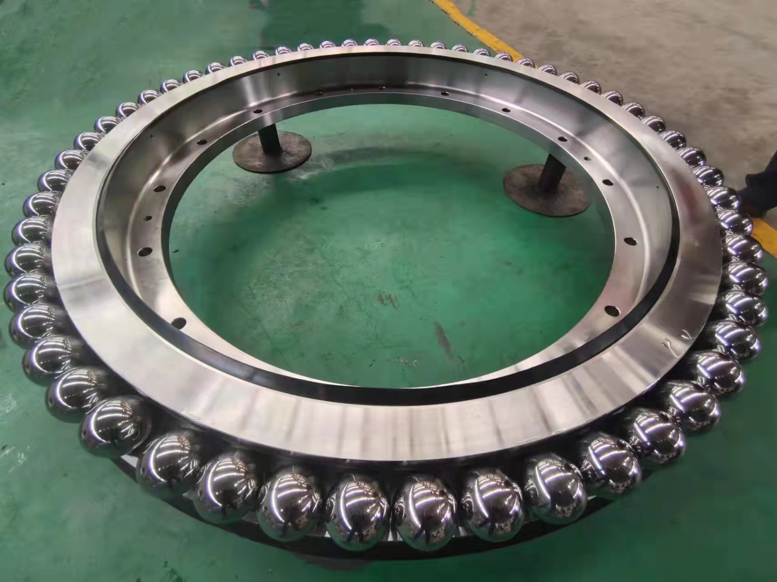 2022年3月,我公司為某客戶自主研制的特種設(shè)備用推力角接觸球轉(zhuǎn)盤軸承LYPF-2190,通過客戶的現(xiàn)場驗(yàn)收。該軸承創(chuàng)造了多個(gè)公司記錄,鋼球直徑***大(鋼球直徑Φ100),套圈壁厚***大(外套壁厚526mm),***大齒輪模數(shù)(模數(shù)30),工序***多(端面槽、內(nèi)徑缺口和大模數(shù)齒面淬火都是***次加工),是我公司***次加工轉(zhuǎn)盤軸承種類少見的單排推力角接觸球轉(zhuǎn)盤軸承。